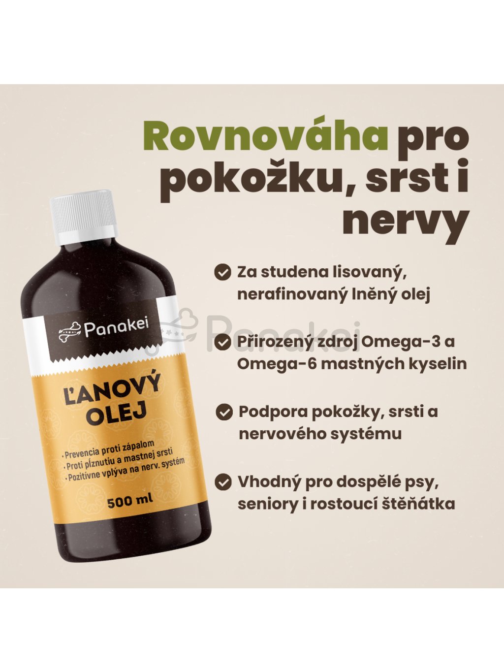 Za studena lisovaný, nerafinovaný lněný olej pro psy. Olej je vyráběn šetrným lisováním za studena ze semen lnu setého (původ CZ/SK).