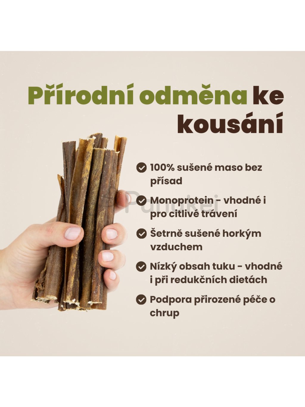Doplňující informace: Pamlsky podávejte vždy pod dohledem. Podávejte jako odměnu mezi běžným krmením. Vždy zajistěte přístup k čerstvé pitné vodě. Produkt je určen jako doplňkové krmivo pro zvířata. Není určen k lidské konzumaci. Naše přírodní pamlsky jsou vyrobeny výhradně z kvalitních surovin a sušeny pouze horkým vzduchem (bez chemických konzervantů). Díky tomu si zachovávají přirozenou vůni, barvu a tvar. Menší odchylky mezi výrobními šaržemi jsou přirozené a potvrzují ruční, přírodní výrobu. Pamlsky jsou zdravé, bezpečné a skvělé pro každého psího miláčka. Děkujeme, že podporujete přírodní produkty pro psy.